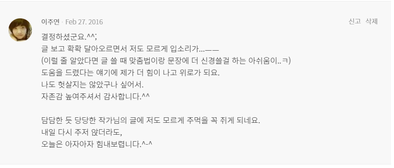 글을 쓰기 시작한 이래로 가장 기억에 남는 사람을 한 명 꼽으라면 단연 이주연 님이다. 글에 담긴 나의 고민을 들어주는 사람이 있다는 걸 깨닫게 해 주었기 때문이다. 특히 재입사나 퇴사를 고민하던 시절에 만났던 그녀의 댓글은 나의 의지로 결정을 내리는 데 도움을 주었으며, 앞으로도 평생 잊지 못할 것 같다.