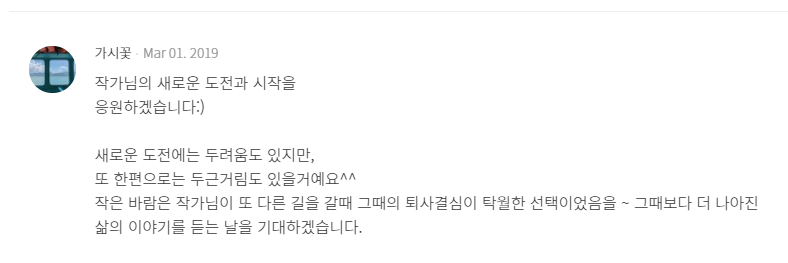두 번째 직장에서의 퇴사가 결정되고 올린 글에 가시꽃님이 댓글을 달아주셨다. 가시꽃님이 누구인지는 아마도(?) 모르지만, 댓글을 읽으면 절로 하늘을 향해 두 손을 뻗으며 환호를 내지르고 싶은 마음이 생긴다. '그래, 잘 그만두었을 거야'라고 생각하며 홍제천을 걸으며 댓글을 보았던 기억은 여전히 선명하다.