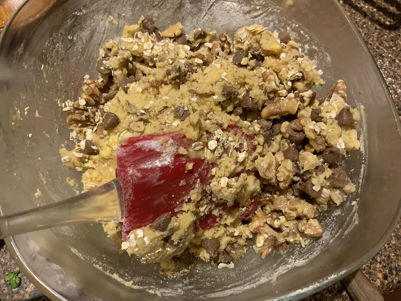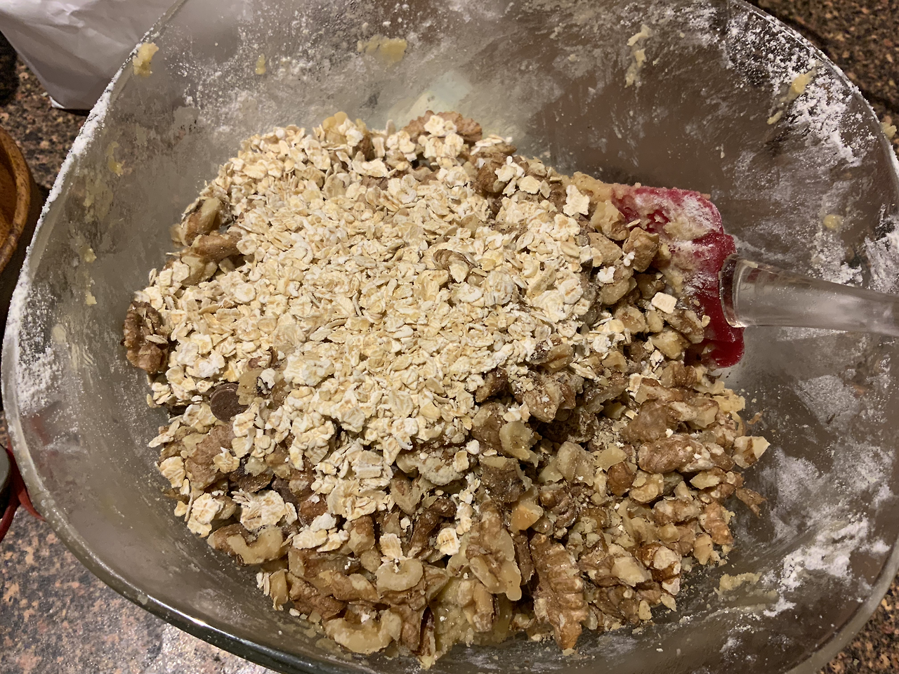 3. 볶아놓은 호두, 초콜릿 칩스, 오트밀을 잘 섞어준다. *반죽이 무게감이 있어 힘이 들지만 적당히 잘 섞어준다.