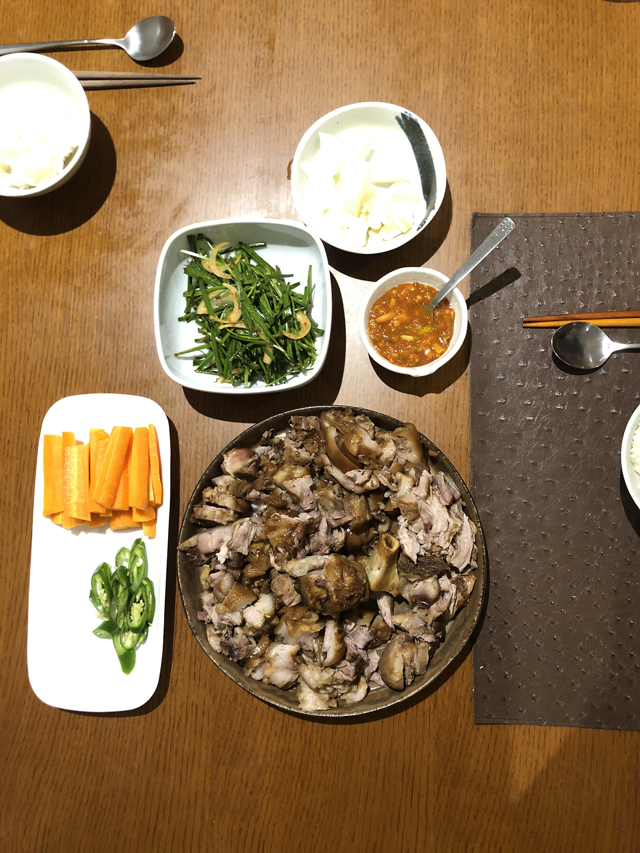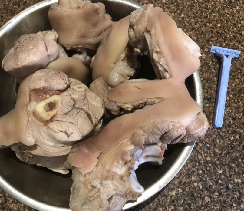 2. 건져내어 다시 찬물로 씻는다, 이때 고기에 묻어있는 불순물을 잘 제거하고 족에 남아있는 털을 깨끗이 면도해 준다. (이건 그날 족의 상태에 따라 일의 양이 달라진다, 사진의 경우 전혀 털이 남아있지 않아 수월했다)