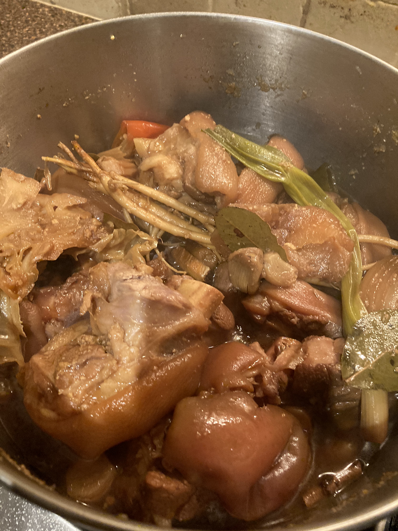 1. 족을 씻어 냄비에 물을 잠갈만큼 넣고 소주 2-3잔(소주잔)과 함께 초벌로 20분 정도 삶는다.
