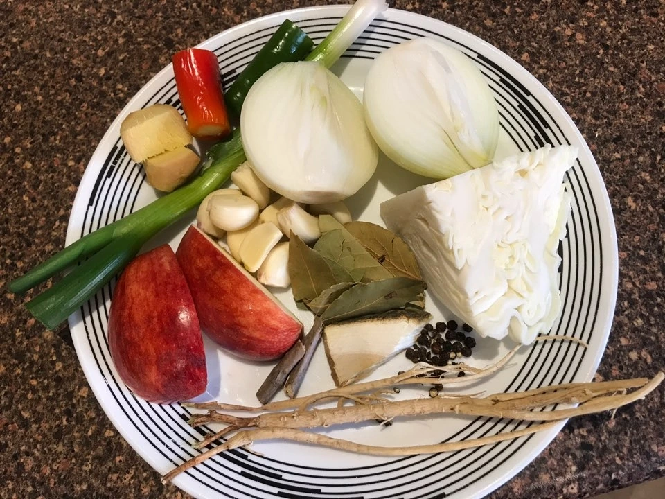 부재료: 양파 1개, 대파 큰 것 1개, 통마늘 10알, 생강 1조각, 사과 1개, 월계수 잎 5-6장, 통후추 10알 정도, 남은 배추 혹은 양배추 밑둥부분, 한방재료 약간