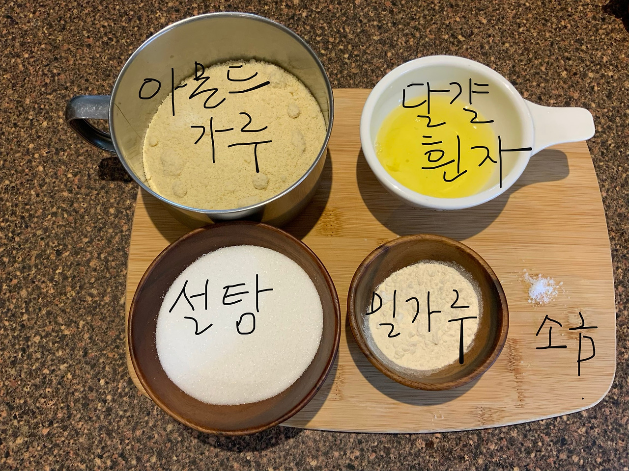 재료: 아몬드가루 225g/ 고운 설탕 180g/ 중력분 32g/ 달걀흰자 60g(달걀 2개 정도)/ 소금 한 꼬집/ 아몬드 혹은 바닐라 에센스 (옵션/생략 가능)