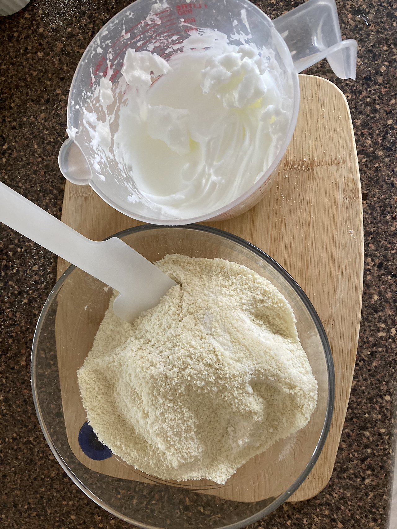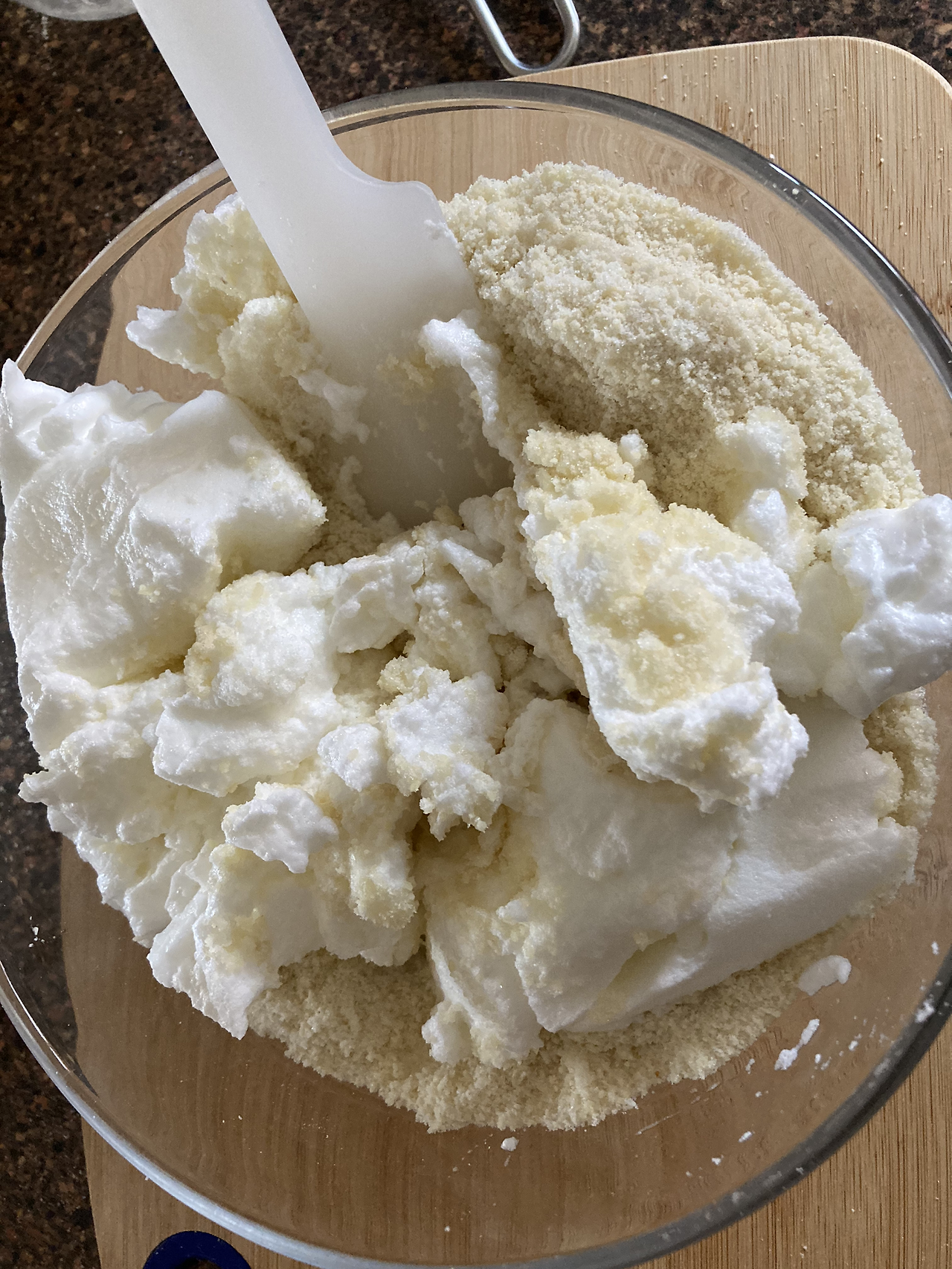 아몬드가루, 설탕, 밀가루에 머랭을 섞는다 (소금과 아몬드나 바닐라 에센스 조금)