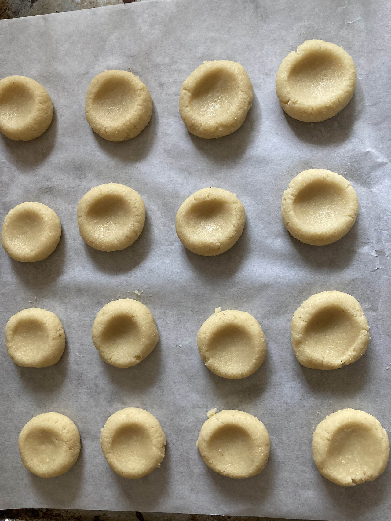 반죽을 이 정도로 마무리하고 트레이에다 동글동글 굴려 놓은 다음 숟가락으로 살짝 눌러주고 30분 기다린다.