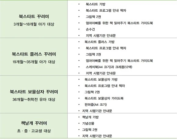 북스타트 코리아 홈페이지에서 거주지역의 북스타트 운동 시행기관을 확인, 해당 기관을 통해 북스타트 운동에 참여할 수 있습니다. 북스타트 운동에 참여하면 ‘북스타트 꾸러미’를 받게 됩니다. 아이의 나이에 따라 성장에 필요한 영양소가 다르듯이, 아이의 월령1에 따라 각각 ‘북스타트 꾸러미’, ‘북스타트 플러스 꾸러미’, ‘북스타트 보물상자 꾸러미’, ‘책날개 꾸러미’가 제공됩니다. 꾸러미에는 관련 분야 전문가들이 선정한 그림책2권과 함께 안내책자, 손수건 등이 담겨있습니다.