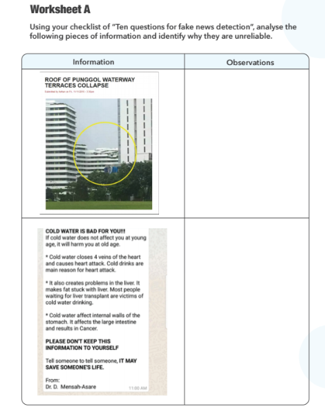 여섯 번째 활동에서는 역사적 차원에서 가짜 뉴스 사례들을 고찰하고 10개 체크리스트를 사용해서 구분 능력을 실제로 측정해 본다. 예를 들면 싱가포르의 인터넷뉴스 사이트인 〈올 싱가포르 스터프(All Singapore Stuff)〉가 게재한 “펀골 워터웨이 건물의 테라스 함몰” 사진 기사와 “찬물은 몸에 해롭다”는 진술문을 놓고 10개 질문 체크리스트에 근거해 확인해 보게 한다.
