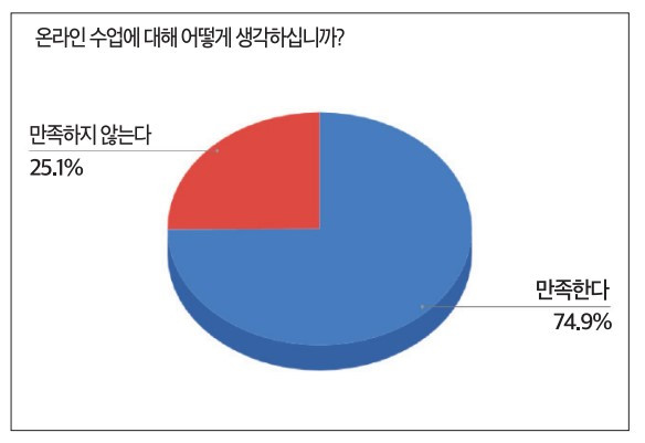 온라인 수업에 대해 학생들은 어떻게 생각할까? 본교 1, 2학년을 대상으로 자체적으로 실시한 온라인 수업 만족도 조사는 유의미한 결과를 나타냈다. 온라인 수업에 대해 ‘만족한다’ 75.2%, ‘만족하지 않는다’ 24.8%로 만족한다는 의견이 더 많았다. 만족하는 이유 중 첫 번째로 손꼽힌 것은 ‘코로나19의 감염으로부터 안전하다’였다. 이것은 코로나19로부터 안전을 확보하기 위해 마련된 온라인 수업의 목적에 부합되는 결과였다. 그 다음으로 ‘집에서 편한 복장으로 수업을 들을 수 있다’, ‘수업 영상의 경우 여러 번 반복해서 듣거나 멈춰서 필기하는 등 자기주도학습이 가능하다’, ‘선택 수업을 할 때 교실을 이동하는 번거로움이 없다’, ‘시간을 효율적으로 쓸 수 있다’, ‘학급 분위기에 휩쓸리지 않고 공부할 수 있다’, ‘궁금한 것을 비공개 댓글을 통해 선생님께 직접 여쭤볼 수 있다’ 순으로 만족하는 이유가 집계됐다. 독립적인 공간에서 자기주도적 학습에 어려움을 느끼지 않는 아이들은 대체로 온라인 수업에 만족하는 것으로 보인다.