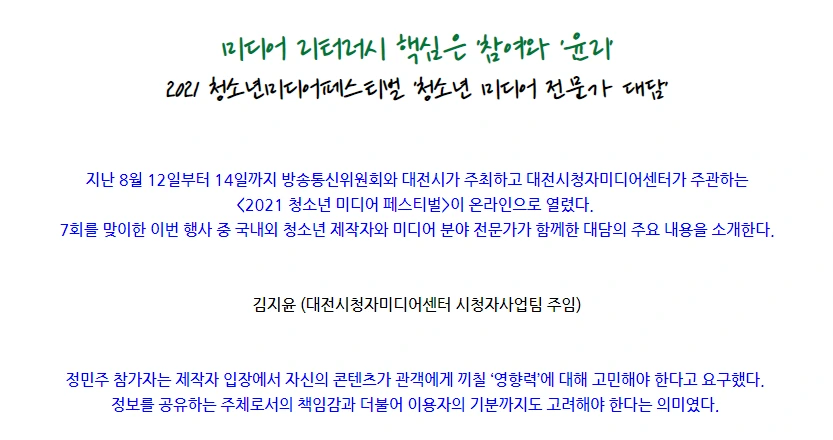 이번 대담은 국내외 청소년의 목소리로 미디어 리터러시의 의미를 재정의하고 미디어교육의 새로운 패러다임을 제시했다는 점에서 큰 의미가 있다. 특히 정민주 제작자의 경험 사례는 미디어교육 기관으로서 대전시청자미디어센터의 역할을 재고하게 만든다. 학교 안팎에서 다양한 교육과 제작 지원 사례를 쌓고, 제작과 참여 역량뿐만 아니라 기존 산업 질서 속에서 제작자로서의 윤리 의식을 길러주는 것이 중요하다. 왕도는 없을 것이다. 지금보다 더 부단히 청소년을 만나고 담론의 주체로 불러와야 한다.
