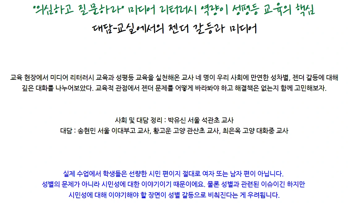 박: 지금까지 다양한 성차별 상황이 미디어와 관련 있다는 이야기를 나누었습니다. 그렇다면 미디어 리터러시 교육의 어떠한 특성이 성평등 교육에 도움이 되고, 중요할까요? 또, 미디어 리터러시 교육 입장에서는 왜 성평등 교육이 중요한지 선생님들의 이야기를 듣고 싶습니다.