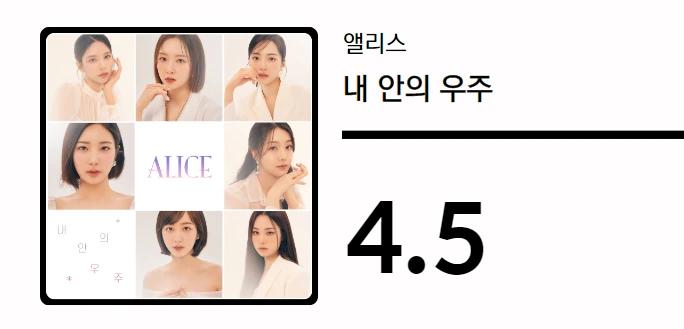 2년이 넘는 긴 공백기 끝에 팀명과 예명을 전부 교체하며 새 출발을 알린 앨리스(ALICE)의 첫 싱글. 허나 피아노와 오케스트레이션을 동원한 '내 안의 우주'는 그룹의 험난한 서사를 바탕으로 감정에 호소하려는 의도만 읽힐 뿐, 새출발을 알리는 당찬 포부나 발전된 기획력이 드러나지 않는 무미건조한 트랙이다.