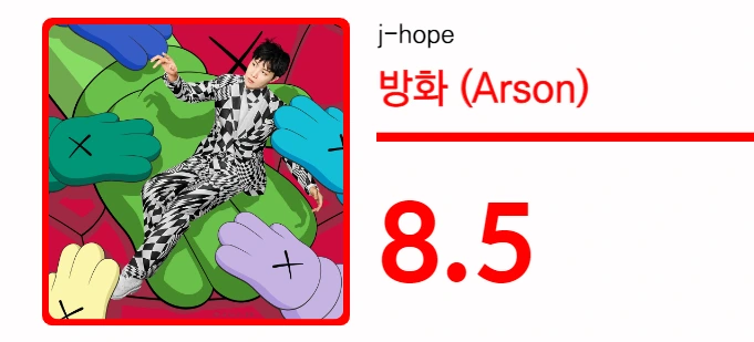 해당 곡의 자세한 리뷰는 정라리 특집 기사 '불꽃과 재의 노래: 제이홉 <방화>' 를 참조해 주시기 바랍니다.