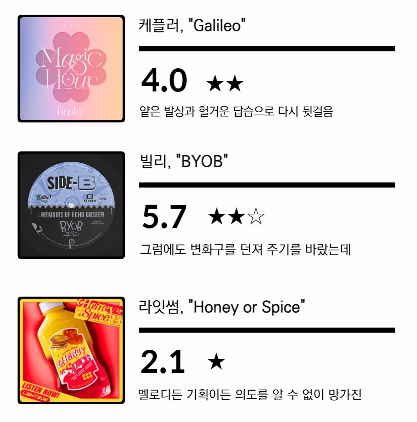 정라리: 외부적 불상사로 인해 그룹의 플랜을 온전히 진행하기 힘들 것은 이해하지만 그럼에도 빌리라면 이보다는 더 신선한 작품을 가져오리라고 기대했기에 아쉬움이 크게 남는다.