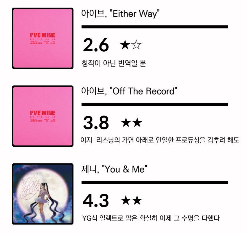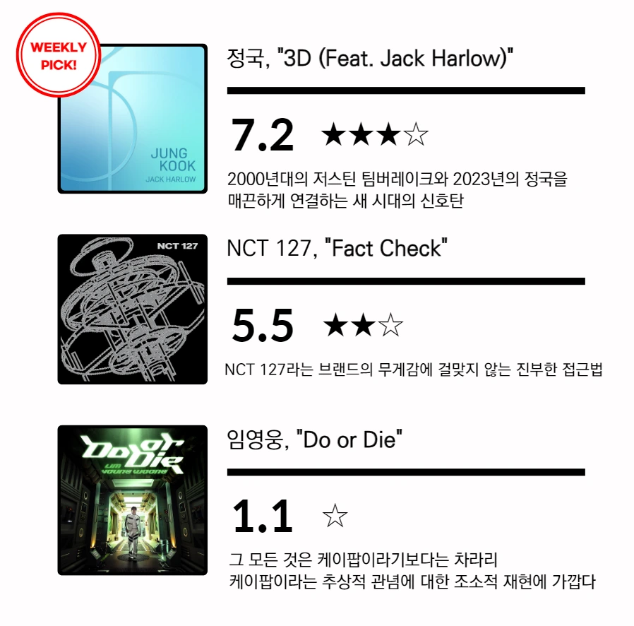 정라리: 나는 케이팝이 도대체 언제쯤이면 영미권 양산형 팝의 허물을 따라 입는 일을 그만둘지 모르겠다.