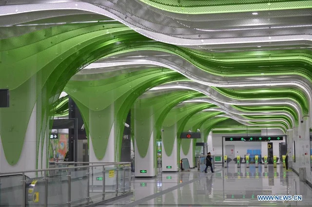 중국 쓰촨성의 청두 지하철역. 건축 영역에서까지 프루티거 에어로/메트로 스타일의 영향을 발견할 수 있다.