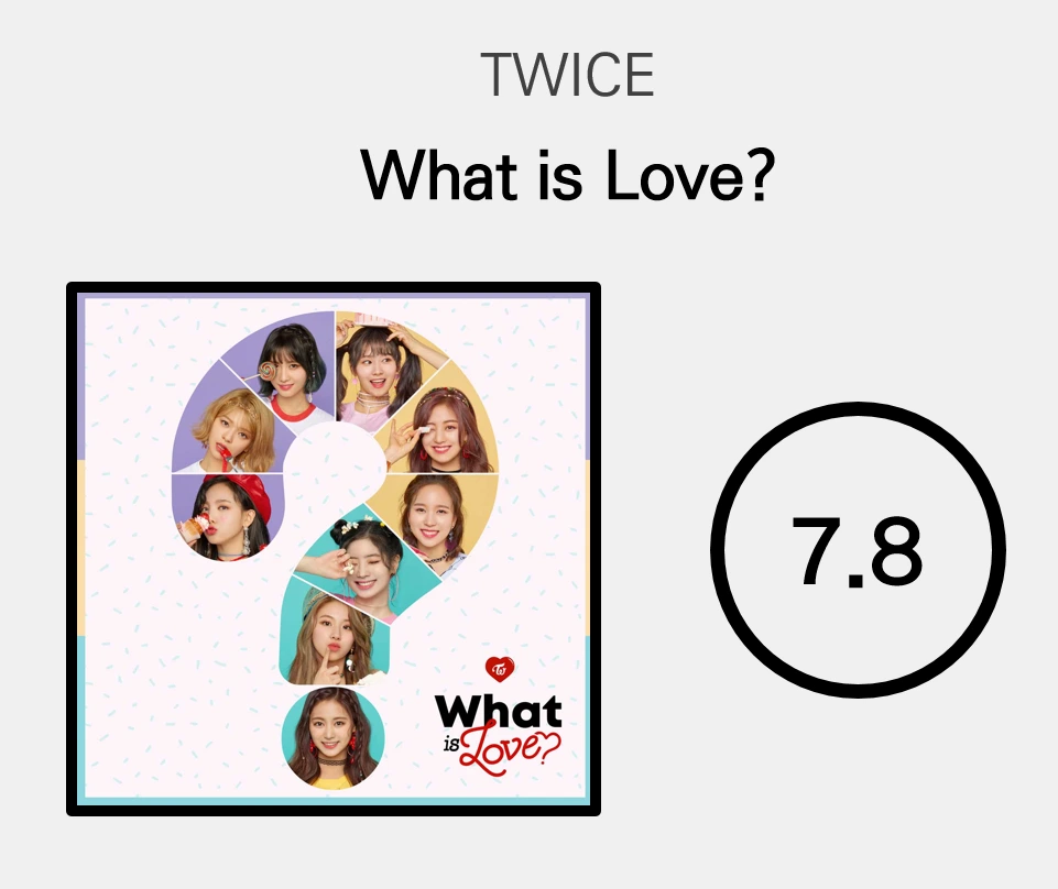 'What is Love?'는 한 마디로 흠잡을 데 없는 훌륭한 곡이다. 트와이스의 세부 장르 가운데 'Knock Knock', 'Heart Shaker' 계열의 소프트 락 넘버 중 가장 완성도가 높다. 드라마틱한 구성, 캐치한 멜로디라인 등 작곡진이 여러모로 심혈을 기울인 것이 보인다. 지효의 파워풀한 보컬이 치고 들어오며 변주되는 후반부는 엄청난 흡인력을 자랑한다.