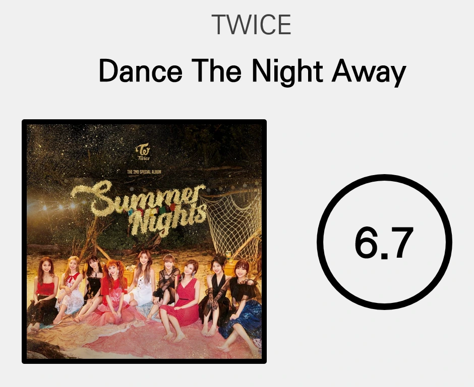'Dance The Night Away'의 멜로디라인은 드랍을 제외하면 굉장히 평이하고 헐겁다. 트와이스의 톡톡 튀는 보컬이 상대적으로 드러나지 못하는 밋밋한 벌스와 프리코러스를 들으면 아직도 그들의 곡 해석력과 소화력이 미숙한 수준에 머물러 있음을 실감한다. 하지만 브라스를 기용하여 기가 막히게 뽑아낸 드랍이 곡의 엉성한 인상을 180도 바꿔놓는다. 분명한 단점이 존재함에도 불구하고, '잘 만든 후렴이 노래를 살린다'는 통설처럼 매력적인 EDM 드랍을 통해 곡을 단번에 심폐소생술하는 데 성공했다.