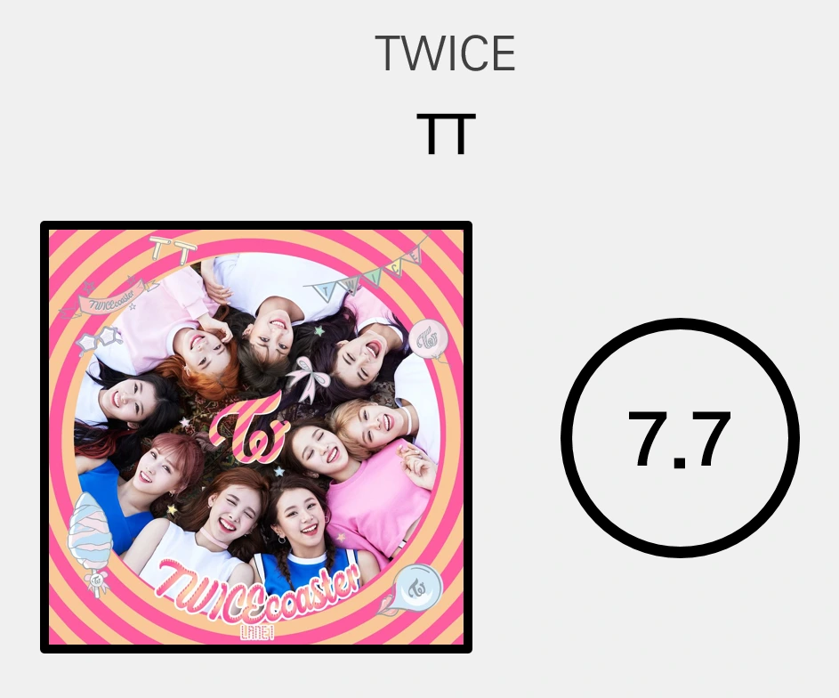 'CHEER UP'으로 만루홈런을 친 트와이스가 이어서 기록한 연타석 홈런. 'TT'라는 후크 포인트를 잘 캐치했을 뿐만 아니라 코러스 자체가 전체적으로 군더더기 없이 깔끔하게 뽑혔다. 이 정도는 해야 국민적 히트곡이 된다. 물 흘러가듯 자연스럽게 전개되는 곡의 구성과 멤버들의 캐릭터를 맛깔나게 살려낸 디렉팅은 '순진무구하고 상큼발랄한 소녀'라는 트와이스의 이미지가 대중에게 성공적으로 각인될 수 있었던 배경에는 영리하고 전략적인 프로듀싱이 존재했음을 보여 준다. 'TT'는 이러한 정교한 설계와 공간감 넘치는 사운드, 유려한 프로듀싱이 한데 모여 탄생한 웰메이드 신스 팝 곡이다.