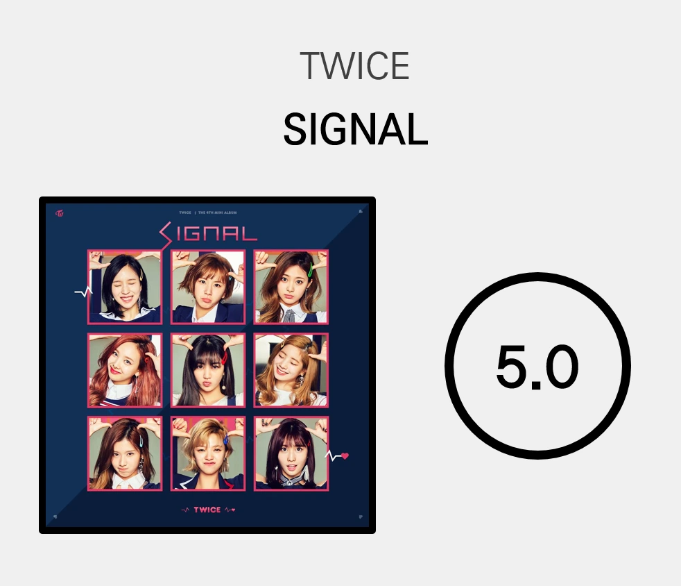 트와이스는 음악적 완성도가 높은 음악을 가져오는 팀은 아니지만 마음 편하게 즐기기 어려운 곡을 내놓는 팀도 아니다. 그러나 변명의 여지가 없이 박진영의 안일함이 낳은 실패인 'SIGNAL'은 트와이스의 커리어 내에서 거의 유일하게 '들어주기가 힘든' 곡이다. 2017년작이라고는 믿겨지지 않을 정도로 촌스럽기 짝이 없는 드럼라인이 곡의 전반적인 인상을 망쳐 놓는다. 멜로디라인 자체는 중독적이고 직관적이나 구성과 사운드의 디테일을 완전히 포기한 탓에 길지도 않은 노래가 지루하고 공허하게만 들린다.