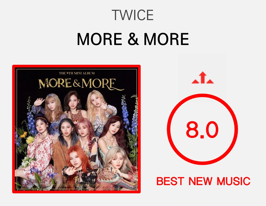 레드벨벳, 블랙핑크 등 타 걸그룹과 비교해 악곡의 평균적인 완성도가 떨어졌던 트와이스지만, MNEK과 자라 라슨 등 트렌디한 해외 프로듀서를 기용한 'MORE & MORE'는 비단 트와이스의 커리어뿐만 아니라 K-POP 전체를 통틀어서도 손꼽힐 만큼 세련된 사운드를 선보였다. 감각적으로 깔리는 베이스를 앞세워 은은하게 리듬을 쪼개는 드랍은 트와이스의 음악적 성숙을 단적으로 드러내 주는 가장 명확한 증거다. 'MORE & MORE'를 통해 트와이스는 드디어 대한민국 대표 걸그룹의 무게감에 걸맞는 예술적 성취를 거두는 데 성공했다.