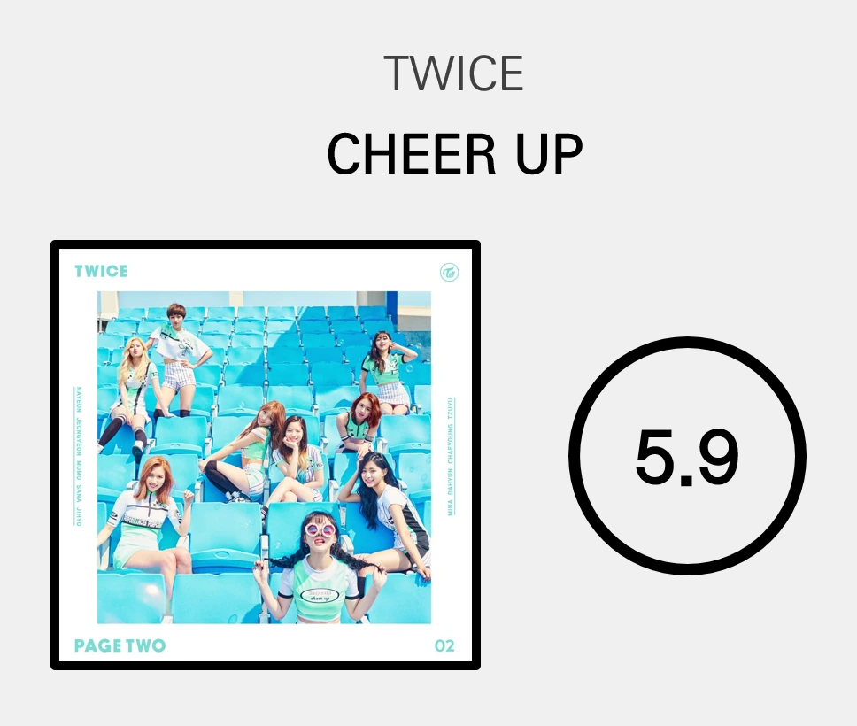 신인 걸그룹이었던 트와이스를 일약 스타덤에 올려놓은 메가히트곡 'CHEER UP'은 사나의 '샤샤샤'와 같은 킬링 파트의 아이돌적 매력을 차치하면 음악으로서의 가치는 희미하다. 변칙적으로 리듬을 전개하면서 통통 튀는 전자음을 흩뿌려 놓아도 여전히 멜로디라인은 크게 와닿지 못하며, 트와이스가 주장하는 유니크한 '컬러 팝'이란 것이 과연 무엇인지 의문을 가지게 한다. 적어도 'CHEER UP'은 유니크하지도 않고, 컬러풀하지도 않다.