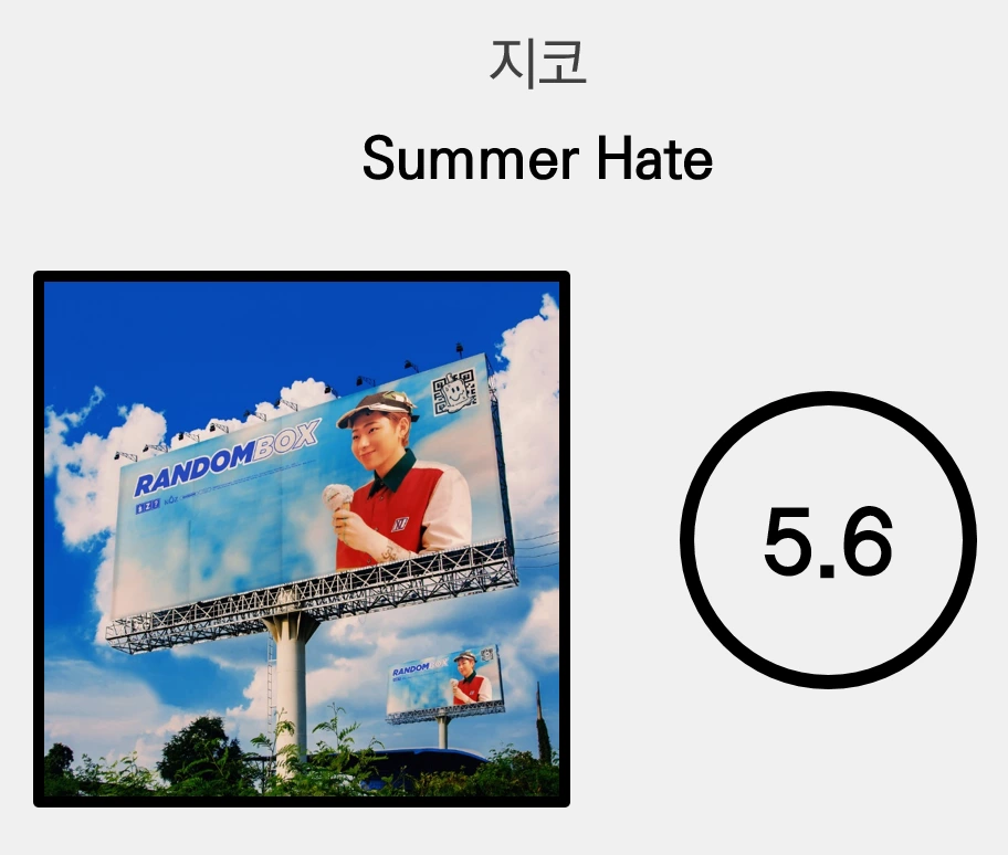 대한민국 남자 솔로 아티스트 중 가장 뛰어난 대중적 성과를 올리고 있는 지코(ZICO)는 본인의 소속 그룹 블락비나 Mnet '쇼미더머니'를 통해 우수한 프로듀싱 역량을 증명해 보인 바 있다. 하지만 정작 그의 개인 작업물은 높은 기대치를 충족시키기엔 역부족이었다. 독립 레이블인 'KOZ'를 설립한 이후 내놓은 싱글 '천둥벌거숭이'와 '아무노래'에서 발전된 음악적 완성도를 성취하는 데 성공한 그였지만, 비와 함께한 서머송 'Summer Hate'에서 다시금 퇴보하고 말았다. 매력 없는 멜로디라인으로 주구장창 12마디나 채워넣은 구성은 지루할 뿐이며 지코의 강점이었던 감각적인 훅메이킹마저 이 곡에서는 드러나지 못한다. 이 때문에 슈퍼스타 비조차도 게스트로서 큰 인상을 남기지 못했다. 관성적이고 진부한 멜로디가 2분가량 계속된 끝에 4마디 동안 뱉어내는 지코의 타이트한 랩은 그나마 사막 속의 오아시스처럼 느껴지지만, 결국 'Summer Hate'는 여름 특수를 노린 안일하고 나태한 실패작으로 남았다.