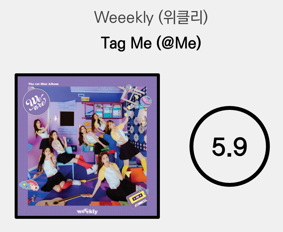 여기저기서 갖다 섞었다. 다 같이 소리높여 외치는 리프레인은 'BOUNCY'의 로켓펀치를, 벌스에서 갑자기 곡이 키치한 트랩으로 전환되는 것은 모모랜드를, 힘찬 기타 드라이브로 곡을 진행하는 것은 트와이스를 닮았다. '최신유행 걸그룹 음악'에서 발견되는 요소들을 모아서 대충 버무린 듯한 'Tag Me'에서는 정작 위클리라는 팀의 색깔을 발견할 수 없다. 그렇다고 후렴이라도 잘 뽑았느냐 하면 그것도 아니다. 사나의 '샤샤샤'가 불러온 걸그룹 음악의 '애교 파트' 트렌드를 우겨넣기 위해 후렴에서'냐냐냐'라는 의미를 알 수 없는 효과음으로 통째로 반 마디를 비워버렸다. 신인 그룹을 가요계에 연착륙시키기 위한 프로듀서의 과욕이 돋보이는 아쉬운 작품.