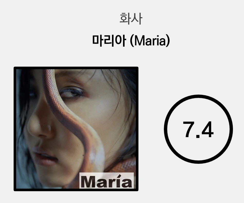 히트 싱글 '멍청이'에 이어 두 번째로 발매된 화사의 솔로 싱글 '마리아'는 틀림없이 훌륭한 곡이다. 화사의 소울풀한 보이스가 극대화되어 드러나는 선명한 멜로디 라인은 프로듀서가 화사라는 아티스트를 얼마나 잘 이해하고 있는지 보여 주며, 이에 더해 브릿지에서는 라틴풍의 리듬으로 변주를 주며 독특한 감흥을 선사한다. 화사의 역량을 최대한으로 이끌어낸 매끈한 웰메이드 팝.