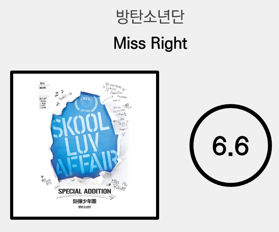 2010년대 초반 한국 가요계에 유행하던 프라이머리(Primary) 계열의 멜로우 힙합 곡인 'Miss Right'는 말랑말랑한 무드로 사랑을 고백한다. 재치있는 RM과 슈가의 랩은 벌스를 기분좋게 채우고, 프라이머리의 '자니'를 연상케 하는 감성적인 코러스는 크게 캐치하진 않지만 곡의 무드를 해치지 않는 선에서 달달한 감흥을 선사한다.