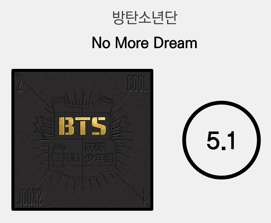 90년대 골든 에라 힙합을 레퍼런스 잡은 베이스를 튕기며 '얌마 니 꿈은 뭐니'를 되뇌이는 방탄소년단의 데뷔곡 'No More Dream'에는 신인의 미숙한 열정이 그대로 전시되어 있다. 목을 긁어대며 랩을 뱉는 멤버들의 퍼포먼스는 그 열의와는 별개로 완성도가 부끄러운 수준이고, 구성과 사운드 면에서도 특기할 구석이 없다. 'No More Dream'은 훗날 K-POP을 대표하는 스타가 될 방탄소년단의 앳되고 어리숙한 모습을 볼 수 있는 초기작이라는 상징성 이외에는 음악적 가치가 없는 싱글이다.