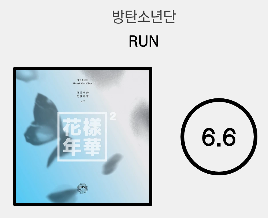 화양연화 시리즈의 두 번째 곡, 'RUN'의 강한 질감의 드럼은 인피니트를 연상케 한다. 코러스를 제외한 모든 구간의 존재감은 희미하지만 한 번 들으면 누구나 따라 부를 수 있는 직관적인 후렴이 곡에 생명력을 불어넣는다. 제목처럼 힘차게 달리는 'RUN'의 에너지는 적당히 기분좋게 다가온다.