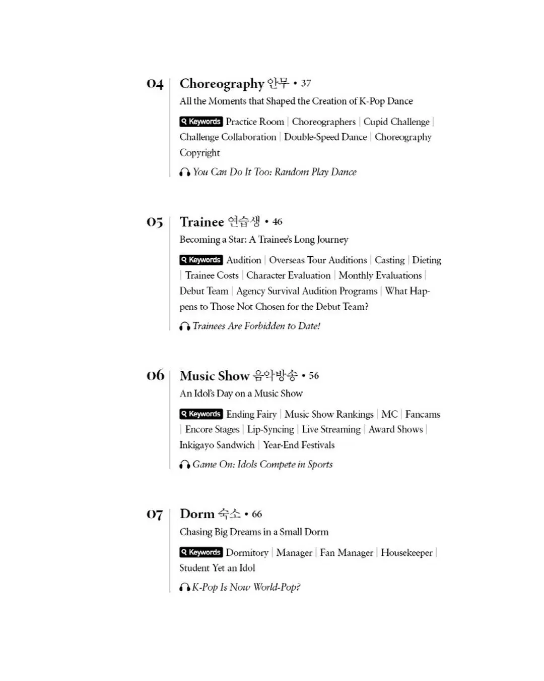 이 책은 다음과 같은 질문들에 답한다. “케이팝의 팬 문화는 어떤 면에서 독특할까? 케이팝은 어떤 음악 장르로 규정지을 수 있을까? ‘틱톡 챌린지’와 ‘랜덤 플레이 댄스’를 유행시키는 아이돌 안무의 비결은 뭘까? 그리고 한국의 연예 기획사들은 어떤 방식으로 연습생을 훈련시켜서 데뷔시킬까?”