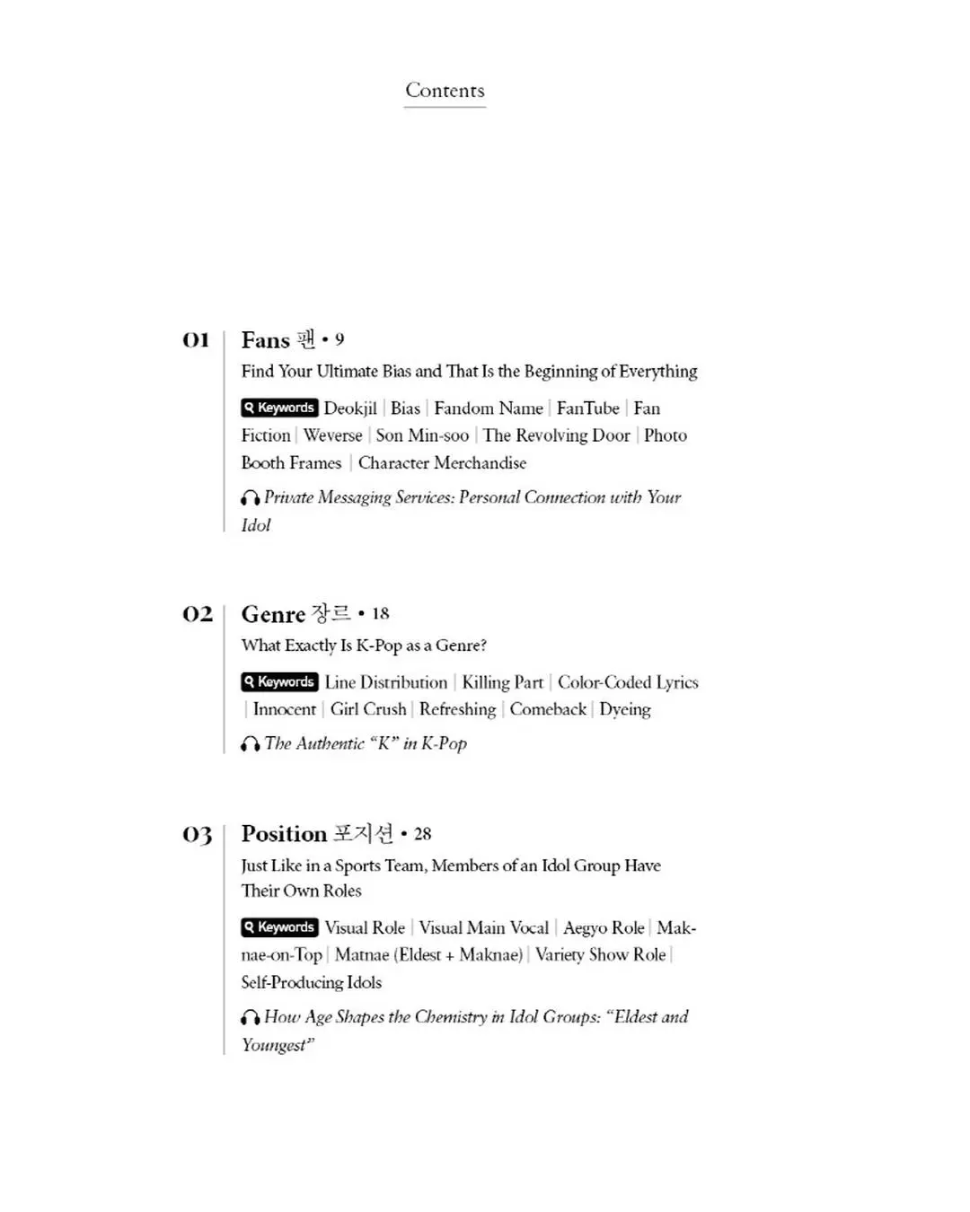 총 13개의 챕터, 약 120개의 키워드에 이르는 알찬 구성으로 연습생 생활부터 틱톡 챌린지까지 케이팝의 모든 것을 쉽고 재미있게 소개하는 책입니다.