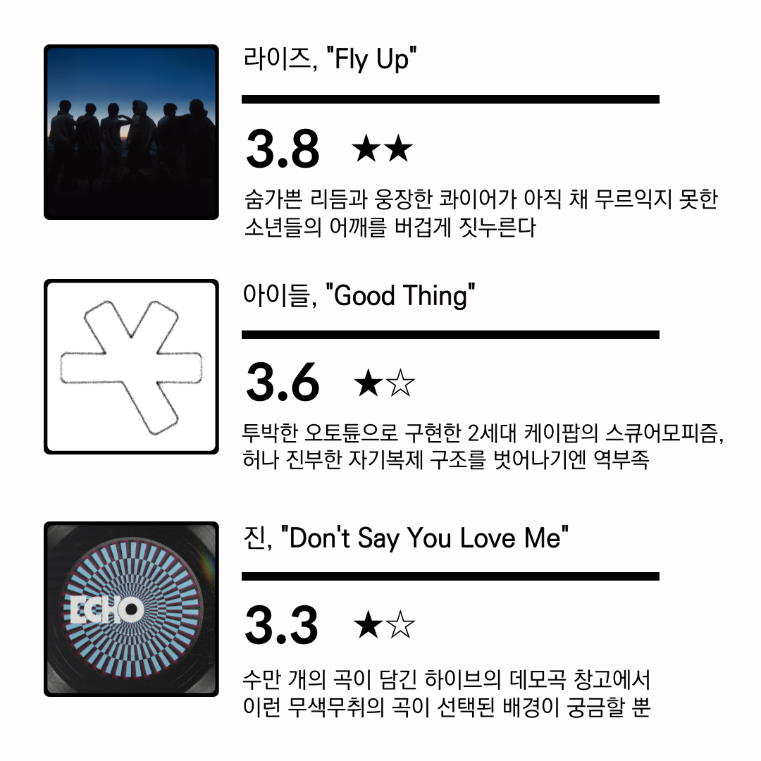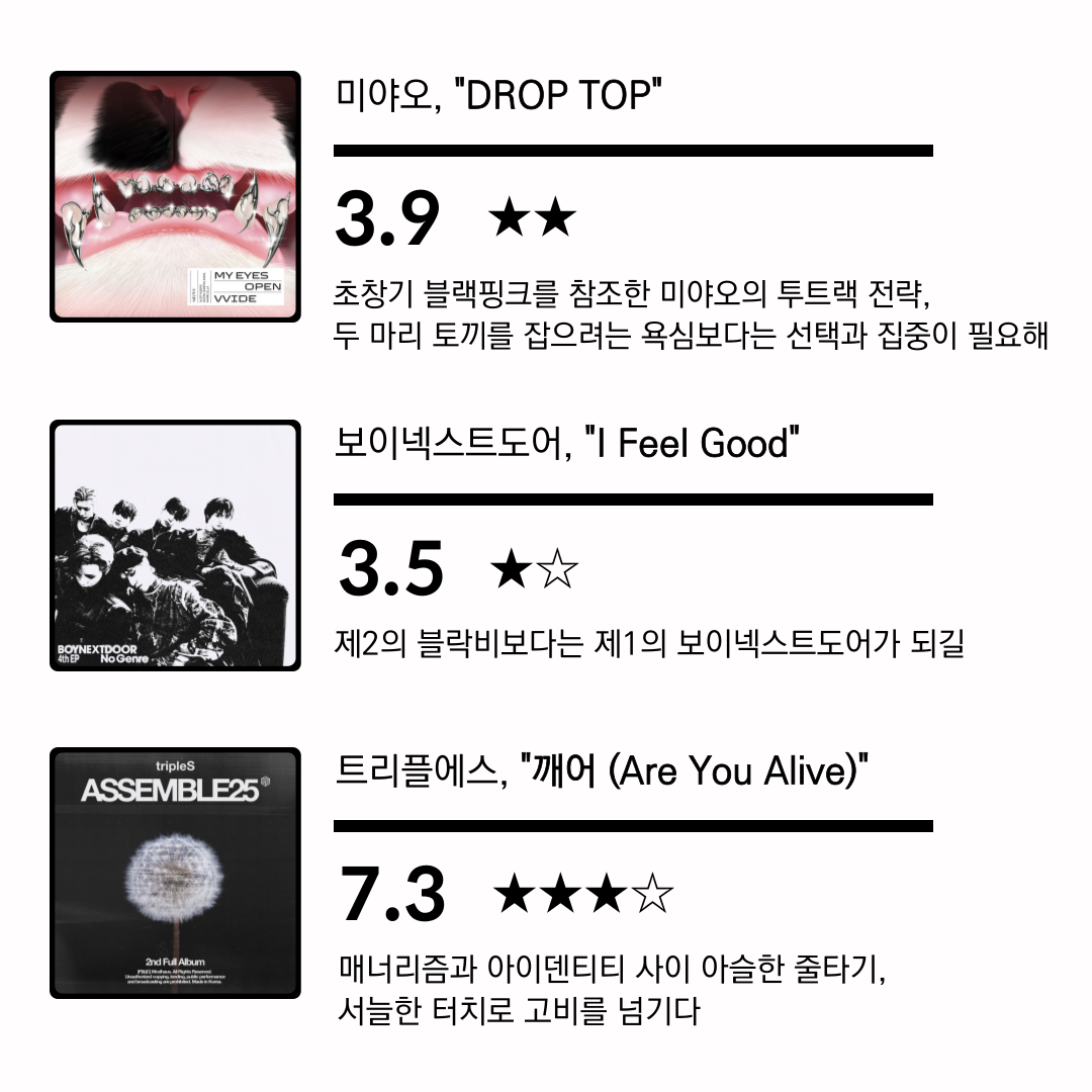 라이즈, 아이들, 진, 미야오, 보이넥스트도어, 트리플에스 등 6곡