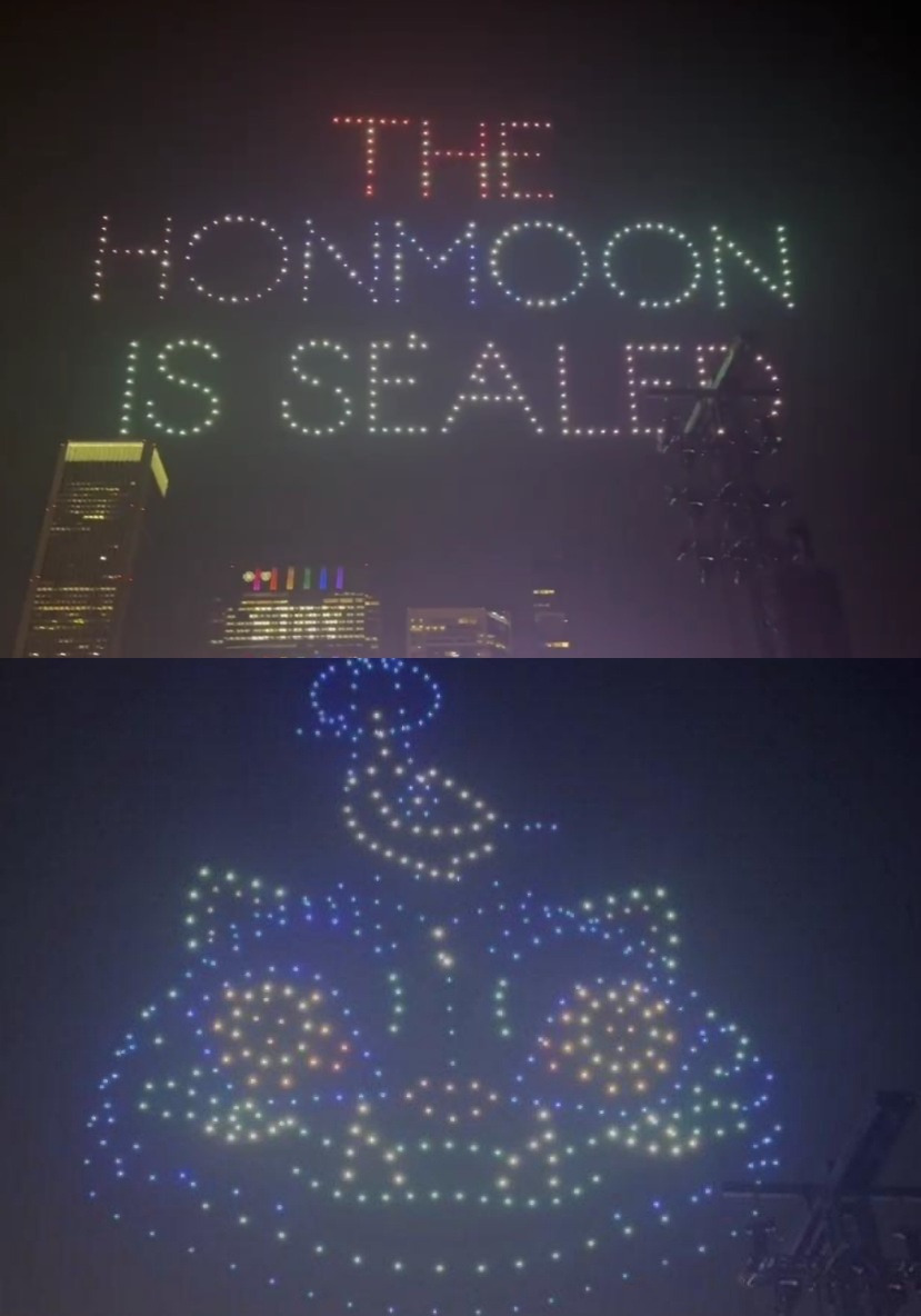 하지만 뭐니뭐니 해도 공연의 하이라이트는, 전세계를 휩쓸고 있는 넷플릭스의 애니메이션 영화 <케이팝 데몬 헌터스>가 깜짝 출연한 드론 쇼였을 것이다. "Golden", "Your Idol" 등 익숙한 OST가 연이어 흘러나오는 가운데 밤하늘에 무수한 드론들이 날아들며 <케이팝 데몬 헌터스>의 캐릭터들을 별들의 도화지 위로 그려낸다. 그리고 '혼문은 봉인되었다(THE HONMOON IS SEALED)'라는 문구와 함께 트와이스의 로고가 등장하더니, 이윽고 영화의 OST로 수록되기도 한 트와이스의 "Strategy"가 흘러나온다. 벅찬 연출과 놀라운 스케일에 절로 입이 떡 벌어진다.
