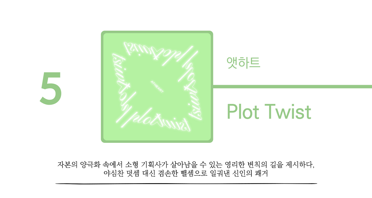 <Plot Twist>는 가난한 자들의 <Magnetic>이다. 요 근래 케이팝에서 대기업의 기술적 전문성이 가장 돋보였던 곡은 아일릿의 <Magnetic>이라 할 수 있는데, 앳하트는 <Magnetic>의 테이스트를 미니멀하게 재해석해 그에 비견될 만한 놀라운 순간을 만들어낸다. 소속사 타이탄콘텐츠가 불과 2년 전 설립된 영세한 스타트업 회사라는 점을 고려하면 이러한 성취는 가히 경탄스럽다. 과장 좀 보태, 나는 <Plot Twist>를 2025년 케이팝 결산에 포함시키지 않는 평론가는 신뢰할 수 없다고까지 생각한다. <Plot Twist>는 소형 기획사의 창작적 역량에 대한 편견을 부수고 케이팝 산업의 자본적 양극화를 돌파할 파괴력을 갖춘 걸작이다.