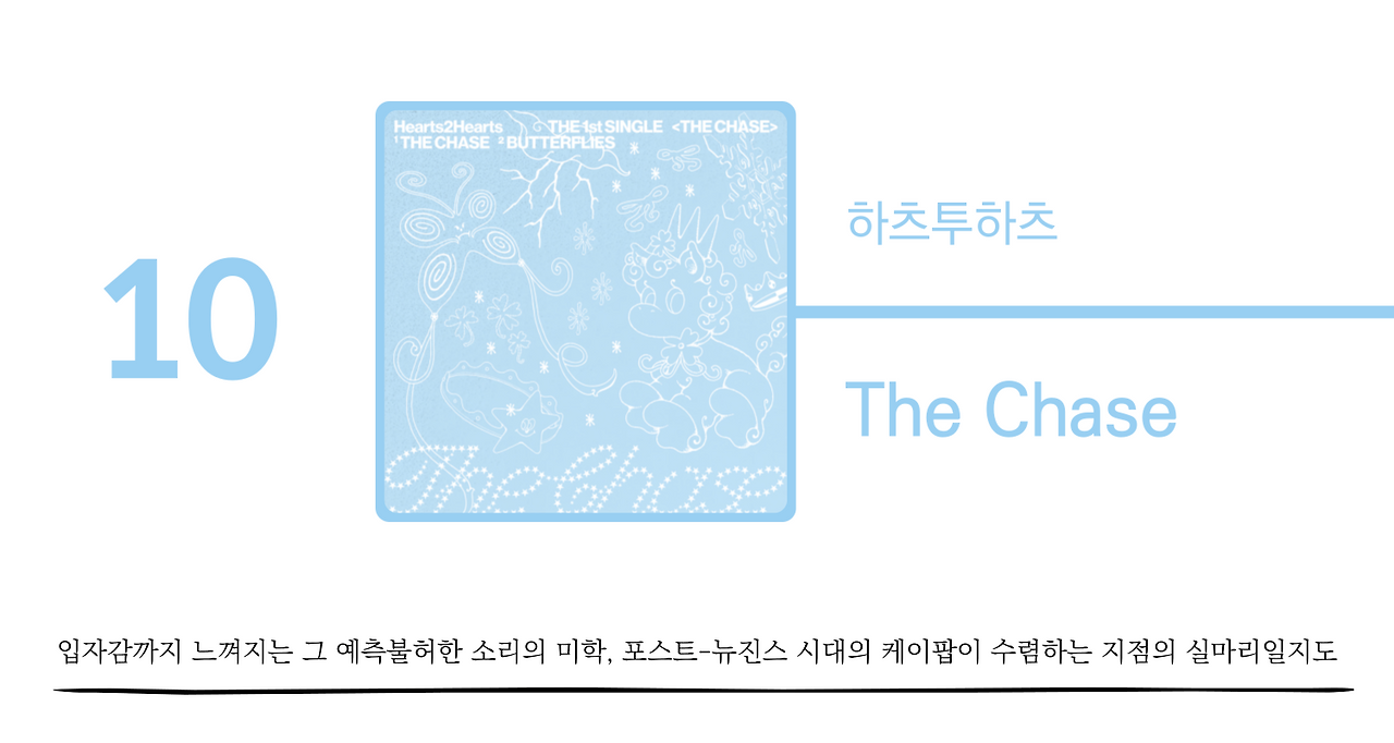 생각해보면 하츠투하츠는 처음부터 달랐다. <The Chase>는 확실히 그 어디서도 들어본 적 없는 데뷔곡이다. 힙합 음악에나 쓰일 법한 두꺼운 베이스가 웅웅대다가 유하의 신비로운 보컬과 피아노가 동시에 예상치 못한 박자로 치고 들어가는 도입부부터 그렇다. 이 도입부의 만듦새는 여러 지점에서 뉴진스의 데뷔작 <Attention>을 연상시키기도 하는데, 차이점이라면 악기들이 점차 서로 부드럽게 스며들면서 이질성이 해소되는 <Attention>에 비해 <The Chase>에서는 그 이질성이 계속 입체적으로 병존하면서 역설적인 구심력을 형성한다는 점이다. 영국의 알앤비 그룹 플로(FLO)가 빚어낸 멜로디와 SM 특유의 보컬 하모니, 배경에서 반짝이는 파스텔톤 신스는 뾰족한 곳 하나 없이 지극히 매끄럽고 달콤한 데 비해, 하이햇과 베이스는 힙합에 가까운 날선 질감으로 세공되어 있다. 코러스에서는 갑작스레 톤다운된 랩으로 전환되며 변곡점을 만들어 의도적으로 전개의 관성력을 끊어내기도 한다.