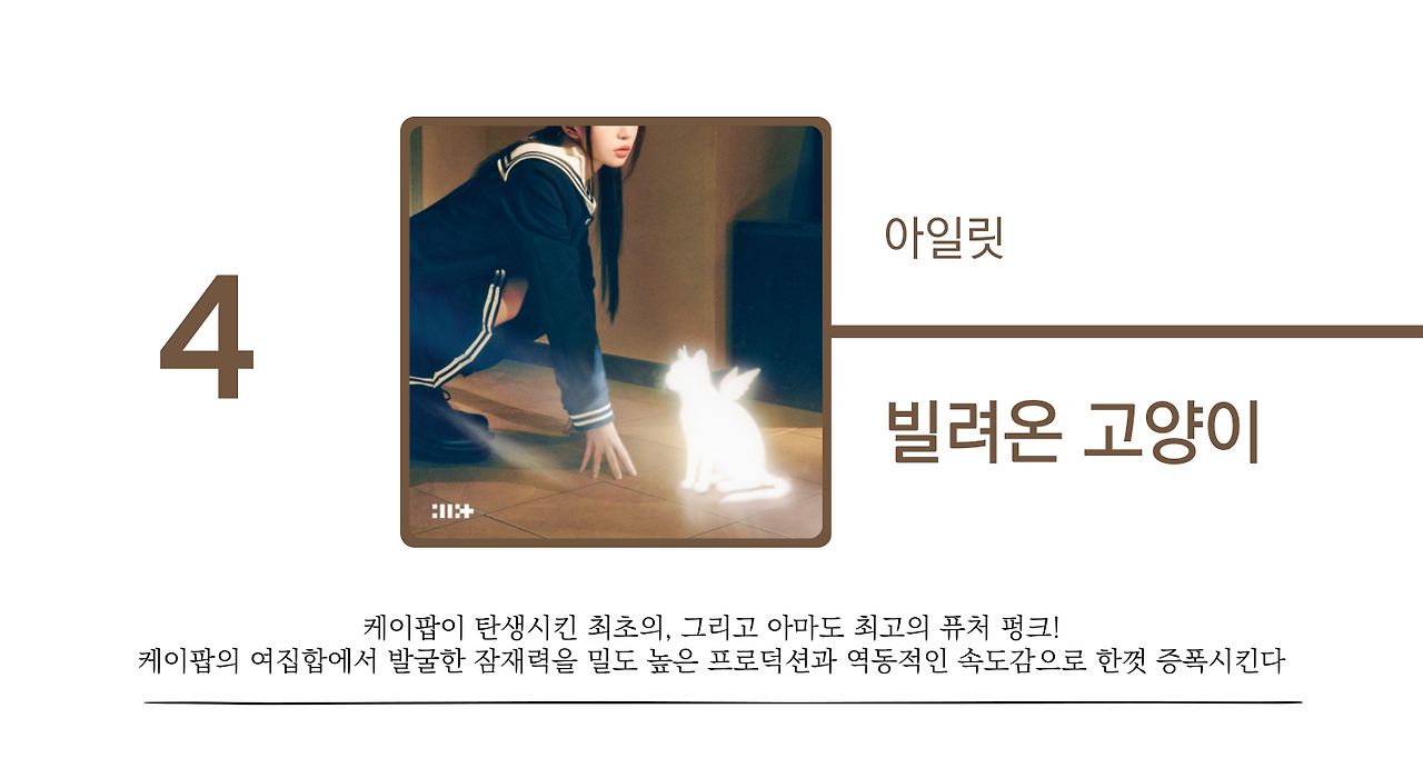 오랜 기다림 끝에 퓨처 펑크는 드디어 케이팝의 영토 안으로 입국했다. 그리고 처음으로 손을 내민 주인공은 아일릿이었다. 데뷔곡 <Magnetic>에서부터 옛 마법소녀물 애니메이션의 향수를 적극 활용했던 아일릿이 퓨처 펑크에 손을 뻗게 된 건 어찌 보면 필연적이었으리라. 앞으로 케이팝-퓨처 펑크 곡이 또 나올지는 알 수 없지만, 적어도 <빌려온 고양이>가 케이팝 산업 내에서 퓨처 펑크 카테고리를 굳건하게 지탱할 ‘장르의 대표작이자 최고작‘으로 오랫동안 자리매김할 것임에는 의심이 없다.