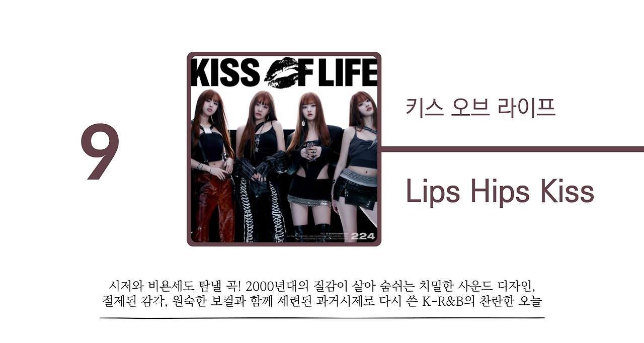 홍수처럼 쏟아지는 아이돌 그룹들 사이에도 키스 오브 라이프가 명확히 차별화되는 지점이 있다. 바로 보컬이다. 특히 벨은 현존하는 아이돌 중 다섯 손가락 안에 꼽히는 재능이라 할 수 있으며, 나띠의 성숙하고 소울풀한 음색은 블랙 뮤직에 부드럽게 녹아든다. 하늘은 스트레이트한 보컬로 곡에 윤기를 불어넣고, 쥴리는 유니크한 보이스를 바탕으로 씬스틸러 역할을 수행한다. 기술적 완성도와 확고한 개성이 조화를 이루는 키스 오브 라이프의 다채로운 보컬 팔레트는 그들이 지닌 최고의 무기이자 대형 기획사의 거대 자본이 결코 따라잡을 수 없는 영역이다. <Lips Hips Kiss>는 키스 오브 라이프의 이러한 강점들이 가장 매혹적인 양태로서 드러나는 작품이다.