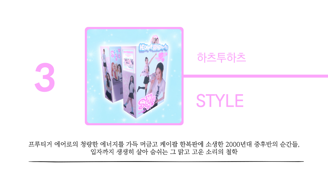 이처럼 <STYLE>은 무정형의 기억들로 흩어져 있던 시부야케이 일렉트로니카의 사운드를 소중히 그러모아 선명한 해상도로 복원해낸다. SM엔터테인먼트는 이를 케이팝의 문법에 부합하는 탑라인과 부드럽게 버무려 케이팝의 영역 안으로 포섭하는 데 성공한다. SM 특유의 위생학적인 믹싱과 보컬 디렉팅이 프루티거 에어로의 미학과 정합적으로 맞물리면서 시너지 효과가 더욱 증폭되는 것은 덤이다. 또한 켄지(KENZIE)가 작사한 노랫말은 천진난만한 10대의 동심을 깨끗하게 표백된 언어로 형상화하며 시부야케이의 낙관적이고 명랑한 정서를 생생하게 재현한다. 군데군데 미묘하게 촌스럽거나 유치하게 들리는 표현들이 오히려 2000년대 중후반의 시대성이 지닌 내러티브를 강화한다. 이로써 앨범 커버 속 핑크빛 스티커 사진 기계는 찬연한 과거를 오늘날의 스크린에 렌더링하는 타임머신이 된다. <STYLE>은 문화산업이 과거의 향수를 활용할 때 지켜야 할 내적 규약들을 완벽히 체화하고 모든 영역에서 이를 섬세하게 수행함으로써 눈부시게 아름다운 미학적 세계를 완성해낸 역작이다.
