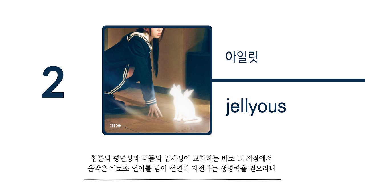 <jellyous>는 아주 간단하게 조형된 8비트 신스를 메인으로 활용하는데, 칩튠 특유의 평면적이고 납작한 소리의 양감이 최소한으로 필요한 공간만을 차지한 채 다른 악기들을 위한 자리를 남겨 준다. 덕분에 입체적인 퍼커션이 더욱 효과적으로 부각되고 담백한 탑라인이 이질감 없이 융화된다. 이 절묘한 균형감각에는 놀라지 않을 수 없다. 이에 더해 <jellyous>의 뮤직비디오는 노골적으로 닌텐도 시대의 프루티거 메트로 스타일 에스테틱을 인용하며 칩튠 팝의 시청각적 생동성을 성공적으로 복원해낸다. 아일릿의 A&R이 고평가받아야 하는 이유는 기획이 지향하는 시공간의 좌표지점을 명확히 인식하고 기획과 음악이 같은 궤도에서 운동하게 만드는 바로 이 감각 때문이다. 퓨처 펑크를 차용한 <빌려온 고양이> 역시 마찬가지다. 소재가 지닌 대중적 소구력의 태생적 한계는 있을지언정 그 내적 정합성과 완성도만큼은 업계 최고 수준임에 의심이 없다.