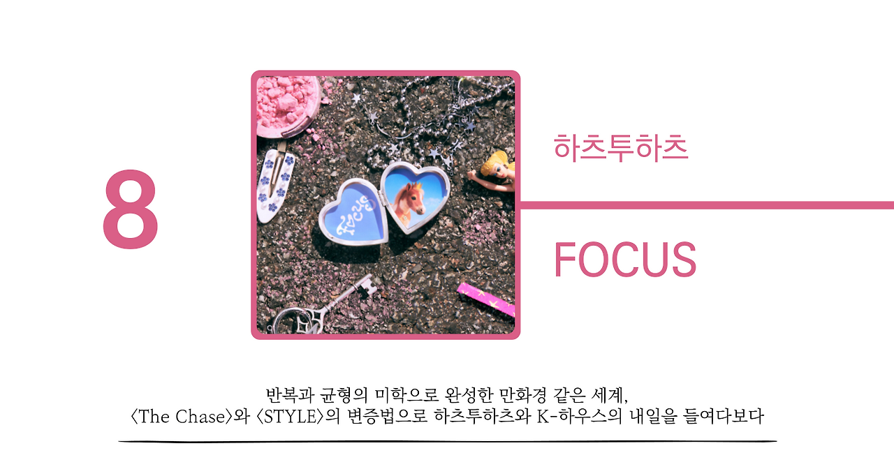 <FOCUS>는 오랜 기간 축적되어 온 SM의 노련한 하우스 프로듀싱 노하우가 빛을 발하는 곡이다. 두께감 있는 보이싱과 풍성한 텐션음이 돋보이는 피아노가 시작부터 비전형적인 화성 진행으로 청자를 몰입시키는 가운데, 매혹적인 베이스와 하우스 드럼으로 섹션들을 세련되게 조립한다. 전체적인 균형감을 잃지 않은 채 확실한 '킥'까지 갖춘 편곡에 캐치한 훅까지 가세해 대중음악으로서의 완성도를 한계까지 높인다. 그 중에서도 드럼을 반 박자 밀며 들어오는 2절 프리코러스('It's you / 내 시선의 중심 세상을 뒤로 미는 중')는 곡의 백미로서 멤버 스텔라의 당도 높은 음색이 그 존재감을 또렷이 각인시키는 순간이다. <The Chase>의 몽환적인 탑라인과 <STYLE>의 세련된 하우스 프로덕션이 정반합적으로 융합된 <FOCUS>는 하츠투하츠의 음악세계를 완성하는 기념비적 성취이자 SM의 건재함을 증명하는 마일스톤이다.