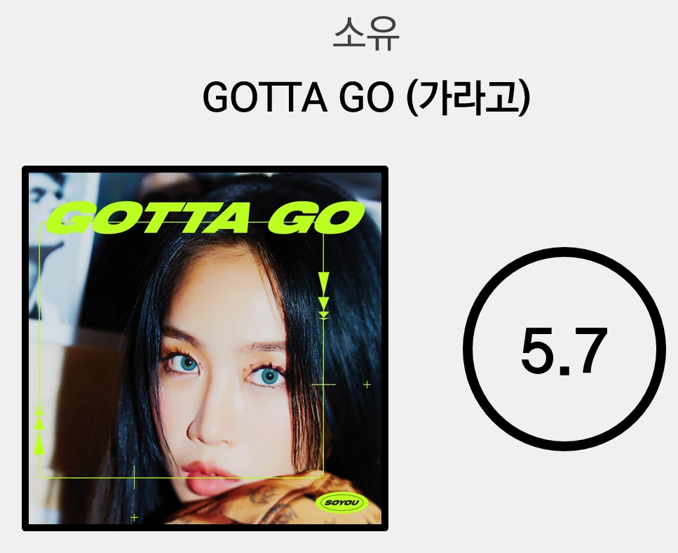 노골적으로 여름 특수를 노린 소유의 'GOTTA GO'는 안일하다. 2000년대 후반을 연상시키는 올드한 멜로디라인은 둘째치고, 날카로운 질감의 신스 드랍과 소유의 보이스가 썩 매끄럽게 묻어나지 않는다. 자신이 가장 잘 할 수 있는 미디엄 템포의 R&B를 버리고 저돌적인 EDM 서머송을 가져온 그녀의 도전은 밋밋하게 끝났다. 후반부 변주를 주며 현란한 플루트를 등장시키는 마무리는 그나마 곡의 뒷맛을 살려 주는 요소다.