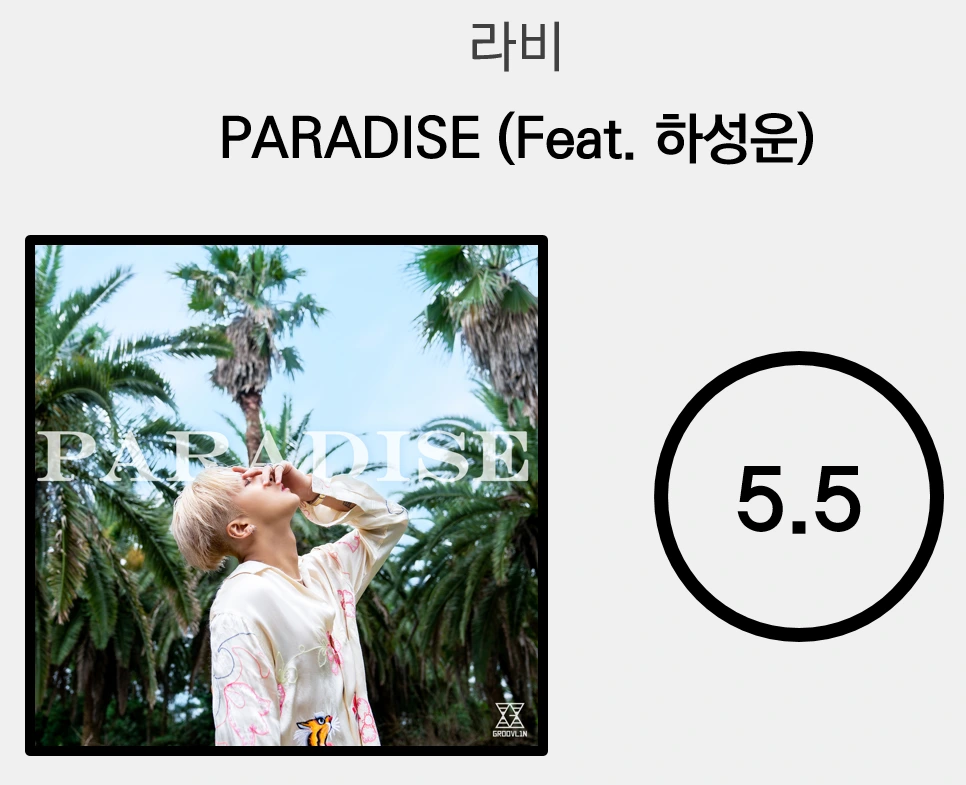 이제 여름철 K-POP의 클리셰가 된 트로피컬 사운드가 인트로부터 들려오는 순간 기대는 줄어든다. 예측은 빗나가지 않고 큰 인상을 남기지 못하는 라비의 벌스에 이어 하성운이 피처링으로 참여한 코러스가 등장한다. 진부하고 부자연스러운 코러스의 멜로디라인은 곡에 오히려 마이너스가 된다. 시너지 효과는 커녕 존재감마저 희미하다.