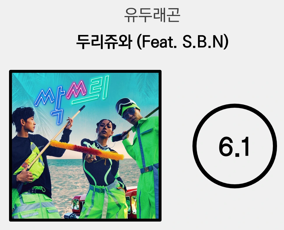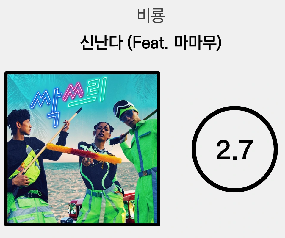 레게풍의 비트를 타고 호흡을 주고받는 비룡과 마마무의 여유가 돋보이는 벌스 이후 갑자기 리듬이 변하더니 뜬금없이 빅룸 드랍이 치고 나온다. 이 부자연스러움은 당황스러울 정도다. 아무리 예능 음원이라지만 이 정도로 이음새에 신경을 쓰지 않아도 되는 건가 싶다. 억지로 이어붙인 빅룸 파트는 그 퀄리티가 오히려 벌스보다 한참 떨어지는데 말이다. '깡'은 재미라도 있었지만, '신난다'는 재미도 없고 신나지도 않으며 뚝심 있게 밀어붙일 깡도 없는 괴작이다.