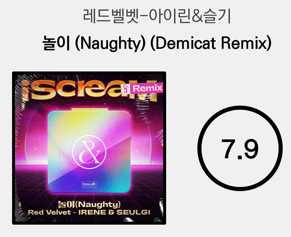 SM엔터테인먼트의 산하 레이블인 ScreaM Records의 프로젝트 'iScreaM'은 매달 SM 소속 아티스트의 곡을 국내외 DJ들이 EDM 장르로 편곡한 리믹스 음원을 공개해 왔다. 'Monster'의 후속곡인 '놀이 (Naughty)'를 리믹스한 '놀이 (Naughty) (Demicat Remix)'는 EDM을 사랑하는 리스너라면 열광할 수밖에 없는 현란하고 화려한 드랍으로 어필하는 곡이다. 파괴력이 부족한 프로듀싱으로 다소 그 인상이 약했던 원작의 약점을 데미캣은 센스 넘치는 EDM 드랍으로 보완했다. 퓨처 하우스, 누디스코 등 다양한 일렉트로닉 장르의 요소들을 그러모아 조화롭게 배치한 재치 넘치는 프로듀싱은 다소 자극적이지만 그만큼 귀가 즐겁다. 감각적이고 번뜩이는 아이디어들의 흔적이 묻어나는 이 리믹스 싱글은 원곡의 재해석보다는 어딘가 부족했던 원곡을 비로소 완성시킨 것처럼 느껴진다.