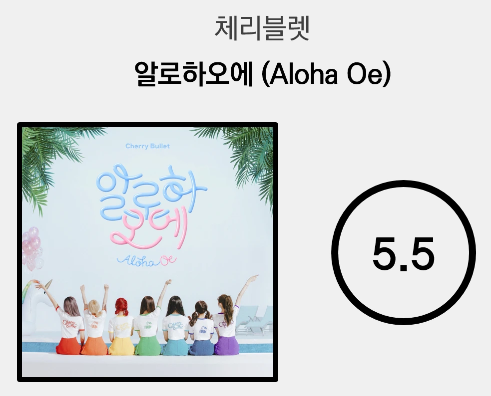 여름이 되면 K-POP 씬에서는 트로피컬 하우스와 퓨처 하우스 트랙들이 앞다퉈 우수수 쏟아져 나온다. 그 양산형 사운드 속에서 '건질 만한' 곡을 찾기란 참으로 어려운 일이다. 체리블렛의 '알로하오에'는 그 사실을 다시금 되새기게 해 주는 곡이다. 시원하게 뻗어나가며 적당한 청량감을 안기는 코러스는 썩 준수하나, 이런 무성의한 멜로디가 어떻게 컨펌받은 건지 의심이 드는 간주의 신스 사운드는 차라리 동요에 가까운 수준이다. 데뷔 초창기 그들이 내놓았던 곡 '네가 참 좋아'의 신스와 질감이 거의 유사한데도 그 활용은 천지차이다. 유아적인 드랍만 제외하면 곡의 만듦새 자체는 꽤나 유려하기 때문에 그 실수가 더욱 아쉽게 다가온다.