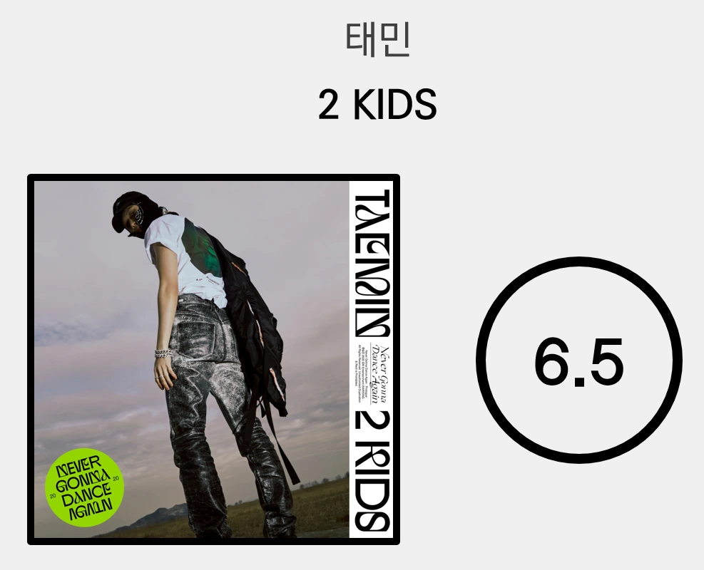 'Never Gonna Dance Again'이라는 도발적인 앨범 제목을 내걸고 발매된 '2 KIDS'는 화려한 사운드보다는 태민의 보컬에 집중하도록 요구하는 트랙이다. 편안한 기타와 피아노, 신스 사운드를 미니멀하게 운용하는 프로듀싱은 그 목적을 훌륭하게 수행하고, 코러스에서 태민의 보컬을 받치는 보코더는 자칫 심심해질 수 있는 곡에 입체감을 불어넣어 준다. 그러나 정작 멜로디가 선명하지 않고 그 멜로디를 소화하는 태민의 보컬도 단순한 가창 이상의 뚜렷한 호소력을 보이지 못해 곡 자체는 다소 애매한 인상으로 남는 것이 아쉽다. 부드럽고 가녀린 그의 보컬이 가진 장점과 한계가 동시에 드러난 싱글.