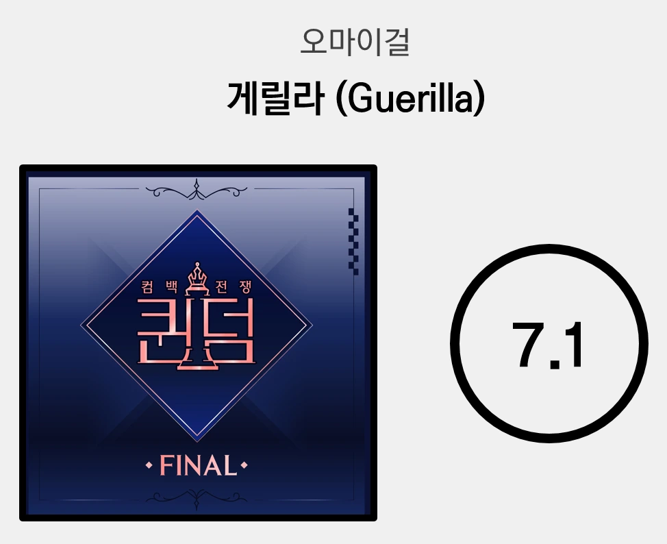 Mnet <퀸덤> 파이널 무대가 낳은 가장 빛나는 발견은 'LION'의 (여자)아이들이었다. 그러나 지난 경연에서 'Destiny (나의 지구)' 등을 통해 한껏 주가를 올린 오마이걸 역시 빼놓을 수 없는 이름임에 분명하다. '게릴라'는 지금껏 그들이 보여주지 않았던 어둡고 공격적인 분위기의 트랙인데, 숨죽인 사운드로 긴장감을 놓치지 않는 벌스에 이어 분위기를 반전시키는 프리코러스부터는 '오마이걸다운' 스트링이 다시 등장하며 반가움을 안긴다. 역동적인 탑라인의 후렴 역시 드라마틱한 사운드와 어우러지며 극적인 맛을 자아낸다. '이런 것도 이 정도로 할 수 있다'는 오마이걸의 당당한 출사표, '게릴라'는 그녀들의 잠재력을 다시금 확인시켜 준다.