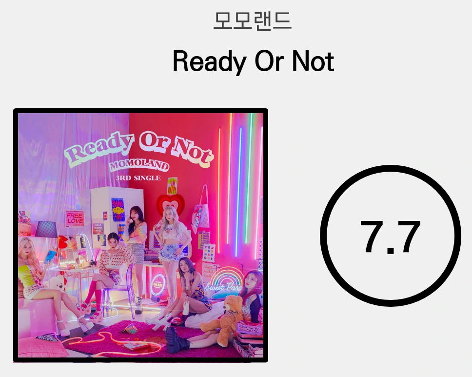 그런 상황에서 발매된 'Ready Or Not'은 우리가 그녀들에게 기대하는 청각적 즐거움을 선사할 뿐만 아니라 팀의 매너리즘을 제법 덜어 내는 교묘한 변화구다. 청량하고 가벼운 비트 위에 쉽고 직관적인 후렴을 얹는 방식에서는레드벨벳의 서머송 '음파음파'나 위키미키의 'DAZZLE DAZZLE'이 연상되지만, 코러스가 끝난 후 현란하게 춤추는 색소폰이 이 곡의 주인은 모모랜드임을 또렷이 각인시킨다. 한여름 바닷가에 딱 어울릴 곡이 초겨울에 나와 버렸다는 점을 제외하면 아쉬움을 찾기 어려운 싱글이다.